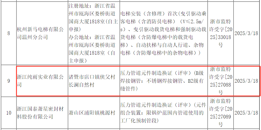2024年3月24日,浙江省市場監督管理局就特種設備許可受理情況(2025年第012批)對外進行公告,據顯示,浙江純雨實業有限公司于3月18日申請壓力管道元件制造換證(評審)(B級焊接鋼管:不銹鋼焊接鋼管、B2級有縫管件)。
