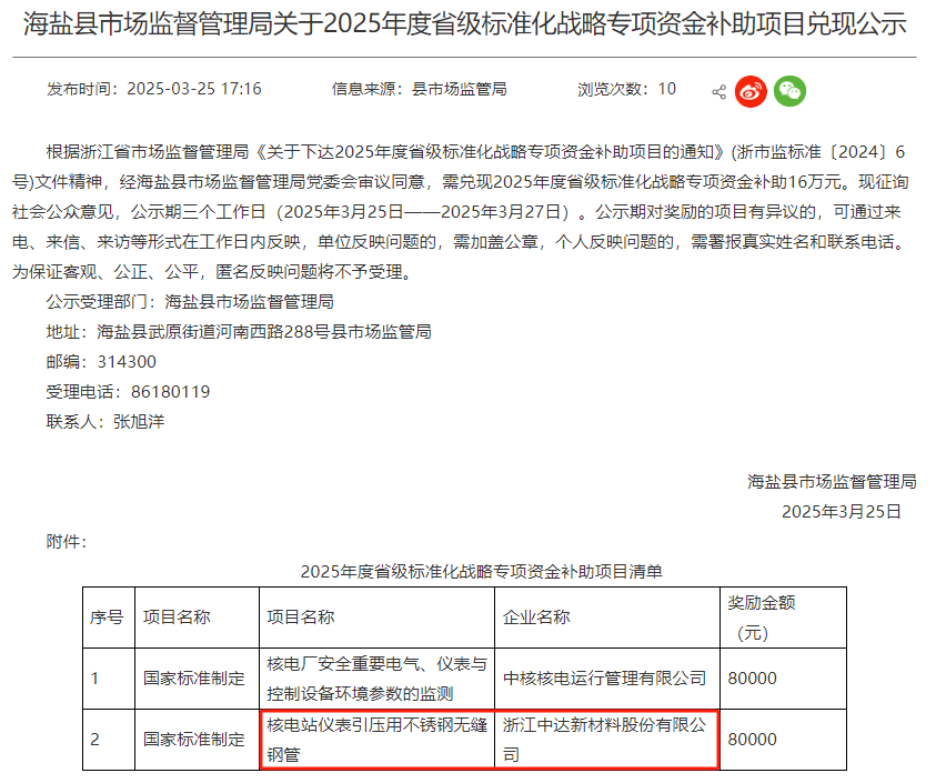 據(jù)顯示,浙江中達(dá)新材料股份有限公司核電站儀表引壓用不銹鋼無縫鋼管項目獲獎勵金額80000元。