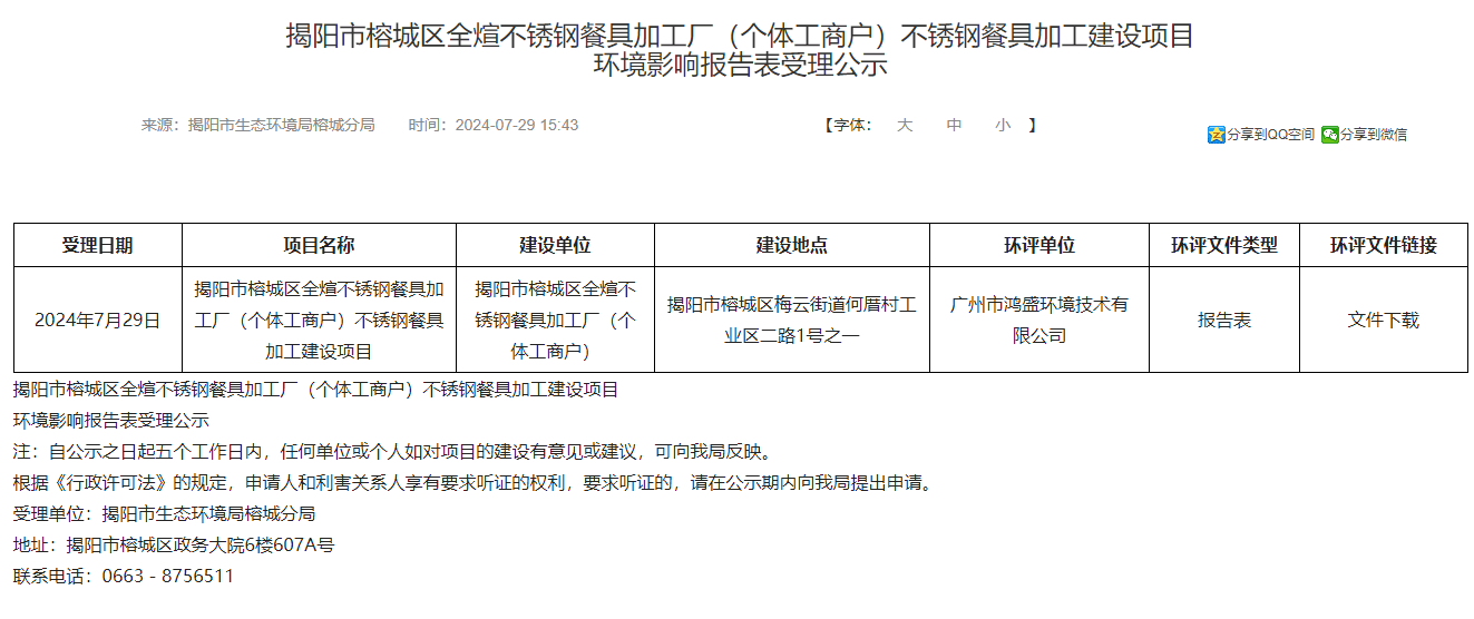 7月30日,揭陽市生態環境局榕城分局受理揭陽市榕城區全煊不銹鋼餐具加工廠(個體工商戶)不銹鋼餐具加工建設項目環境影響評價報告表并對外進行公示,公示期:5個工作日。